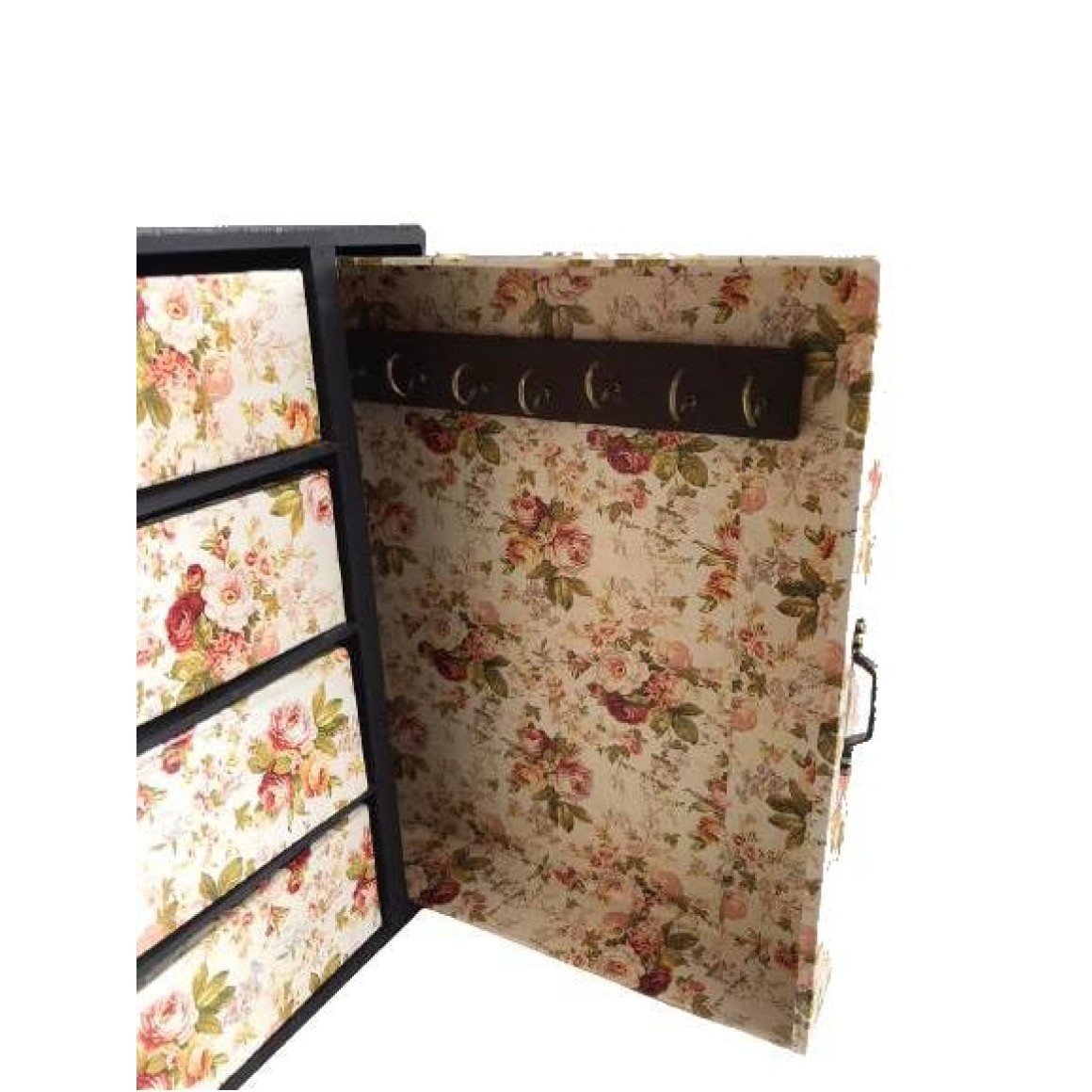 Baú de madeira com estampa de flores grande, pota jóias com gavetas.